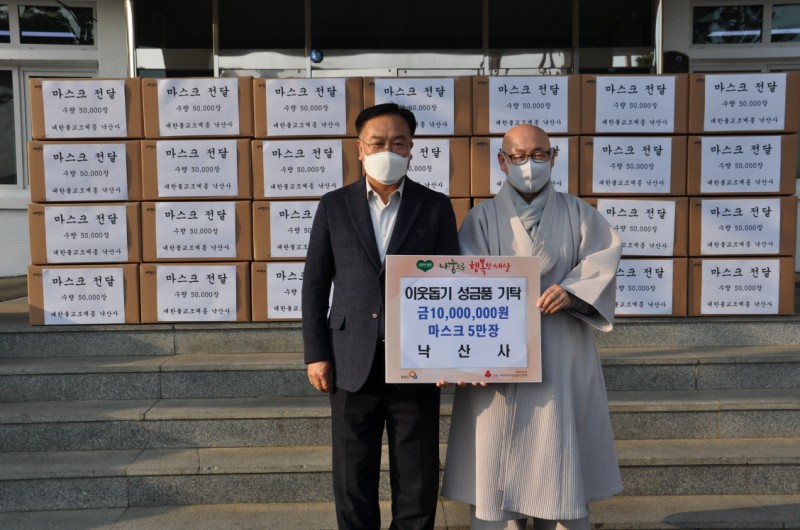 사회복지법인 대한불교조계종 무산복지재단(이상장 금곡스님)은 12월 11일 양양군청에 이웃돕기 성금 1,000만원과 마스크 50,000장을 기탁하였습니다.