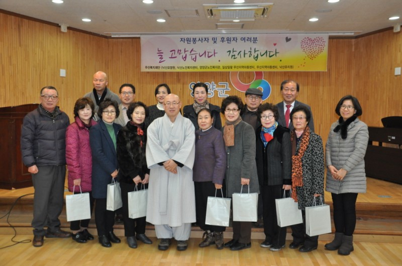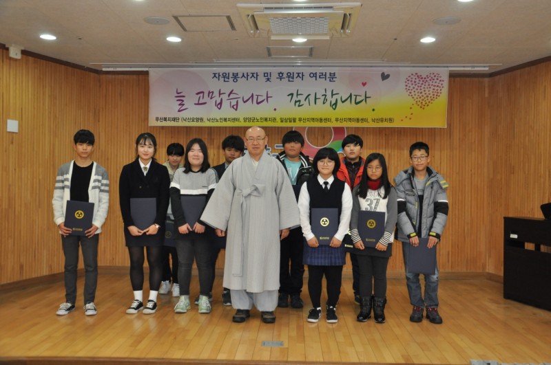 사회복지법인대한불교조계종 무산복지재단(이사장: 정념스님)에서는 2016년 12월 22일 오후 6시 양양군노인복지관에서 본 재단을 후원해주시는 후원자님들을 모시고 후원인의 밤 행사를 실시하였습니다. 본 행사를 시작하기에 앞서 무산지역아동센터 아동들의 댄스공연과 1318무산지역아동센터 학생들의 플룻 및 클라리넷 공연이 있었습니다. 이어서 양양군관내 5개 지역아동센터 우수 장학생 10명에게 장학금 전달식 있었습니다.